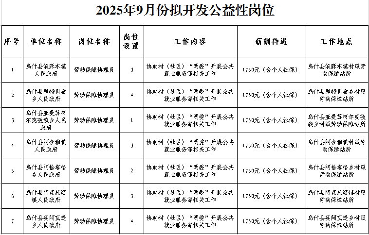 根据自治区、地区和县(市)关于公益性岗位开发管理有关规定,按照“公开、公平、公正”的原则,现就2025年乌什县第九批公益性岗位人员招聘事宜公告如下。